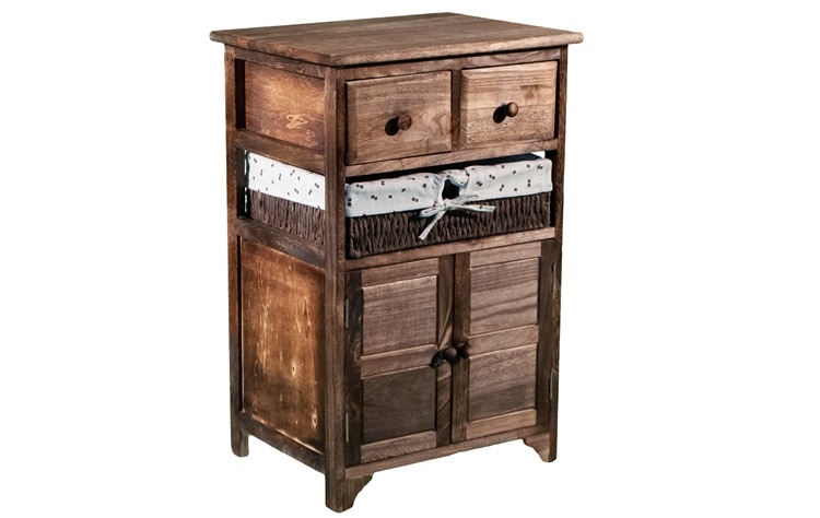 Συρταριέρα με ξύλινο σκελετό με 2 ξύλινα συρτάρια ντουλάπι σε χρώμα καφέ και 1 ψάθινο συρτάρι.
