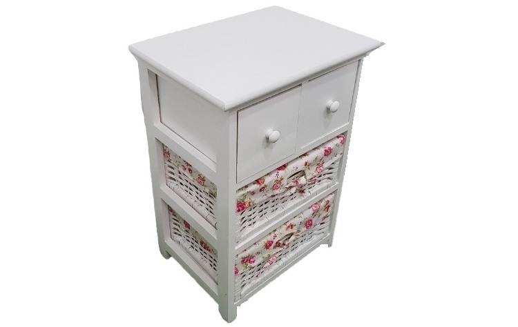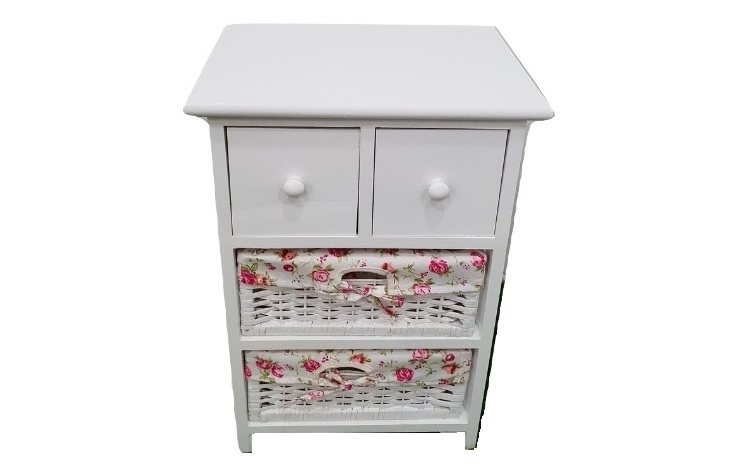 με ξύλινο σκελετό με 2 ή 3 ψάθινα συρτάρια σε χρώμα λευκό.