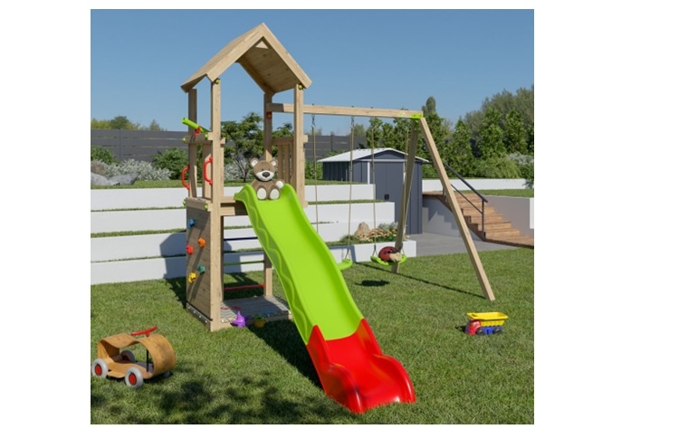 Πύργος με σκεπή, τσουλήθρα, σκάμμα άμμου στη βάση, 2 κούνιες και τοίχος αναρρίχησης.