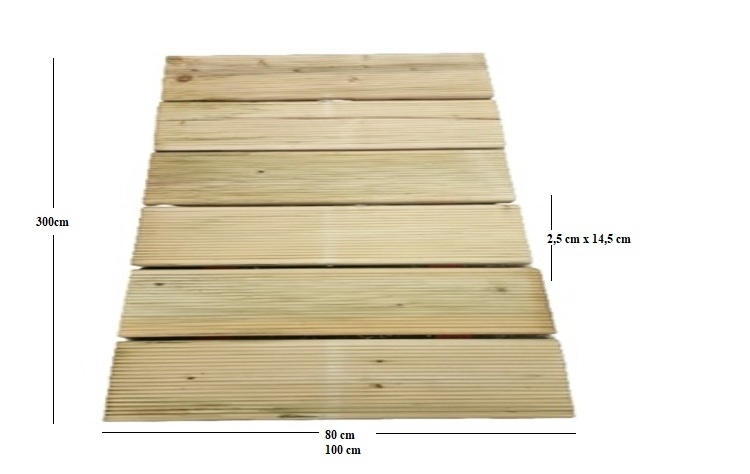 - Στιβαρή Σύνδεση: Η σύνδεση των σανίδων (διαστάσεων 2,5cm x 14,5cm) γίνεται με βιομηχανικό ιμάντα, ο οποίος είναι εξαιρετικά ανθεκτικός στην καταπόνηση και επιτρέπει την εύκολη ανάπτυξη και προσαρμογή του διαδρόμου στο έδαφος.