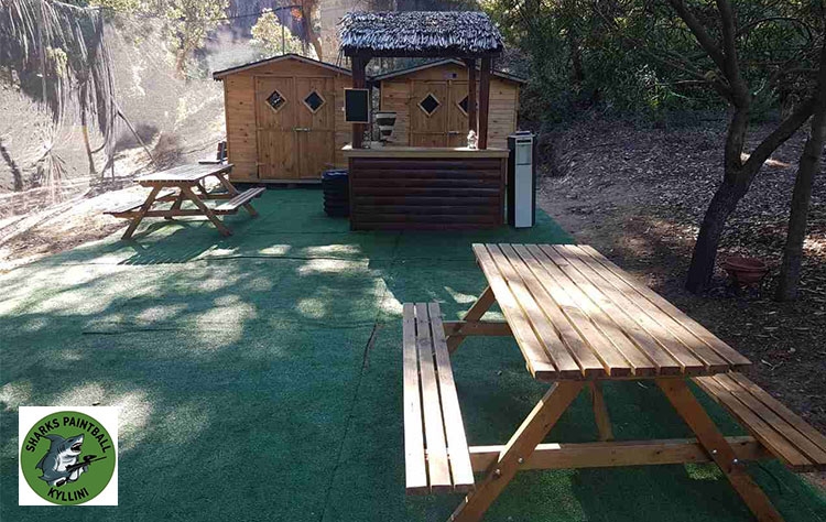 Διαμόρφωση εξωτερικού χώρου στο Sharks Paintball Kyllini με ξύλινα σπιτάκια κήπου, ξύλινο πάγκο εξοχής πικνικ, συνθετικό χλοοτάπητα γκαζον, ξύλινο μπαρ.