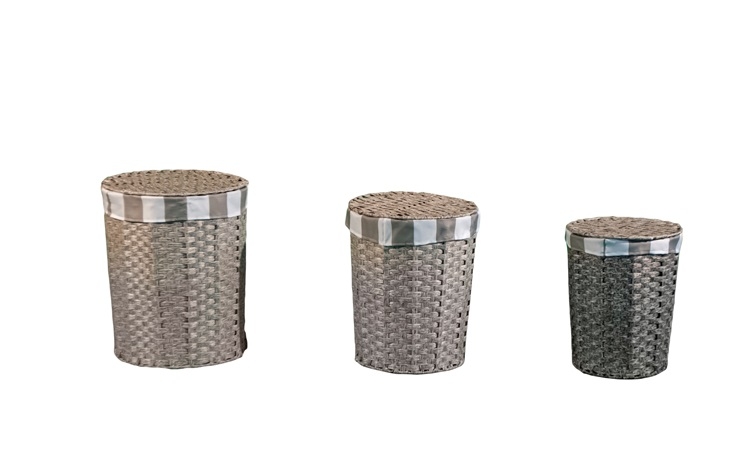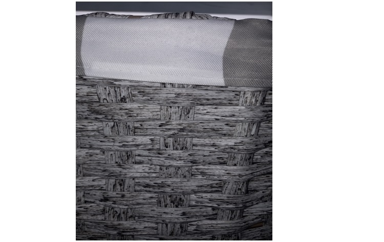 Kαλάθι απλύτων μπαούλο με καπάκι, πλεκτό βέργινο χρώματος γκρι και με υφασμάτινη εσωτερική επένδυση.