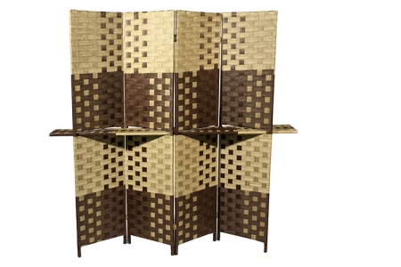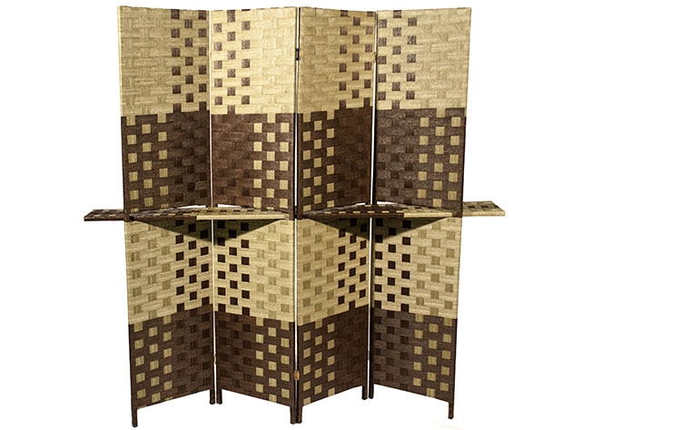 τετράπτυχο πλεκτό ψάθινο, χρώματος λαδί και βέγκε, με ράφι στο