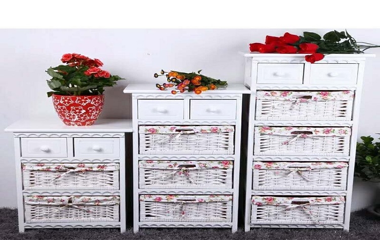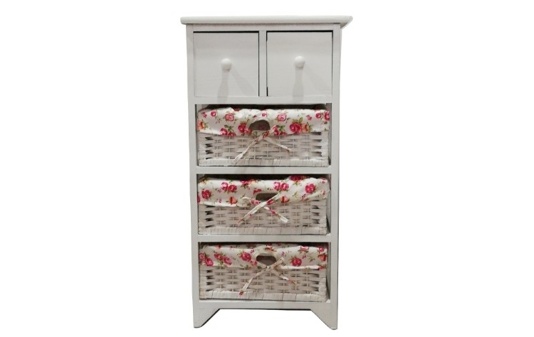 με ξύλινο σκελετό με 2 ή 3 ψάθινα συρτάρια σε χρώμα λευκό.