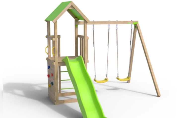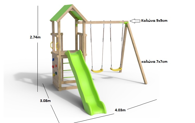 Πύργος με σκεπή, τσουλήθρα, σκάμμα άμμου στη βάση, 2 κούνιες και τοίχος αναρρίχησης.