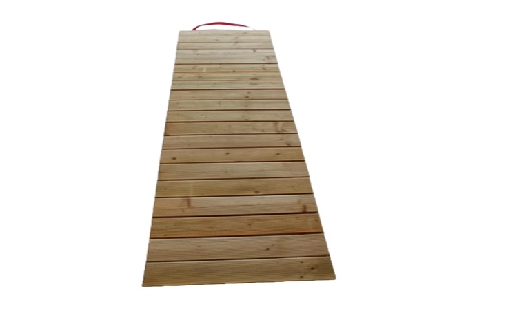 - Στιβαρή Σύνδεση: Η σύνδεση των σανίδων (διαστάσεων 2,5cm x 14,5cm) γίνεται με βιομηχανικό ιμάντα, ο οποίος είναι εξαιρετικά ανθεκτικός στην καταπόνηση και επιτρέπει την εύκολη ανάπτυξη και προσαρμογή του διαδρόμου στο έδαφος.