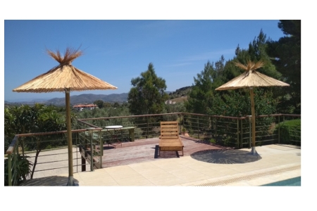 Ομπρέλα παραλίας - με ξύλινη βέργα λεπτοκαρυάς αποφλοιωμένη - σκελετός γαλβανιζέ β.τύπου - ξύλινος κορμός εμποτισμένης ξυλείας - βάση δαπέδου γαλβανιζέ.