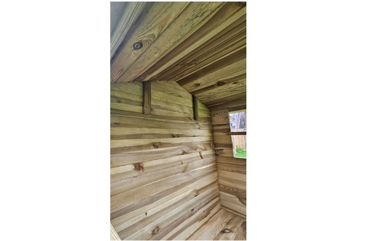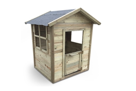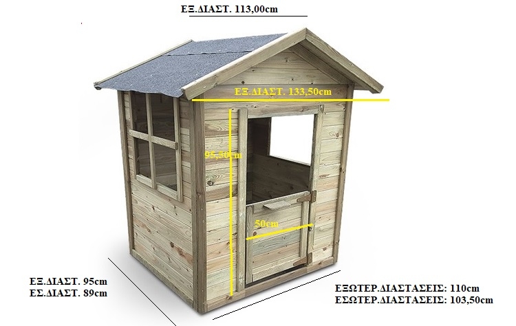 Ξύλινο παιδικό σπίτι με πόρτα και 2 πάραθυρα. Μασίφ ξύλο εμποτισμένης ξυλειας - ανθεκτικό και αρκετά σταθερό. Εξωτερικές διαστάσεις 110x133,5x143(Y)cm , εσωτερικές διαστάσεις πατώματος 103,50cm x 89cm
