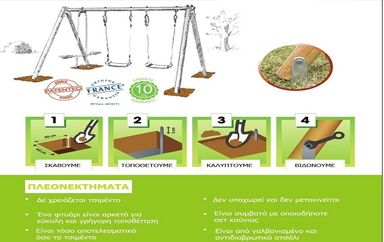 Σκάβουμε σε βάθος 22cm στη διάσταση του πέλματος. Στη συνέχεια τοποθετούμε το πέλμα, το καλύπτουμε με χώμα και τέλος βιδώνουμε την ξύλινη κατασκευή πάνω στο μεταλλικό πέλμα.
